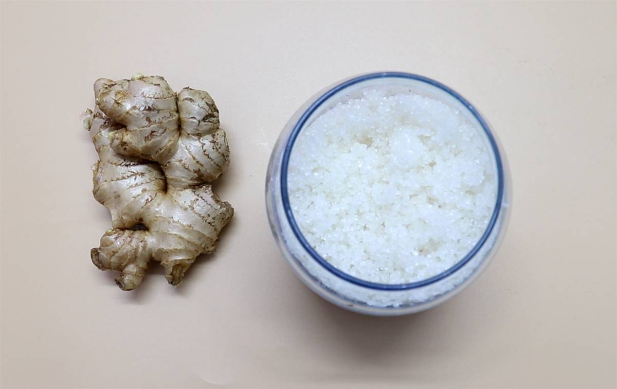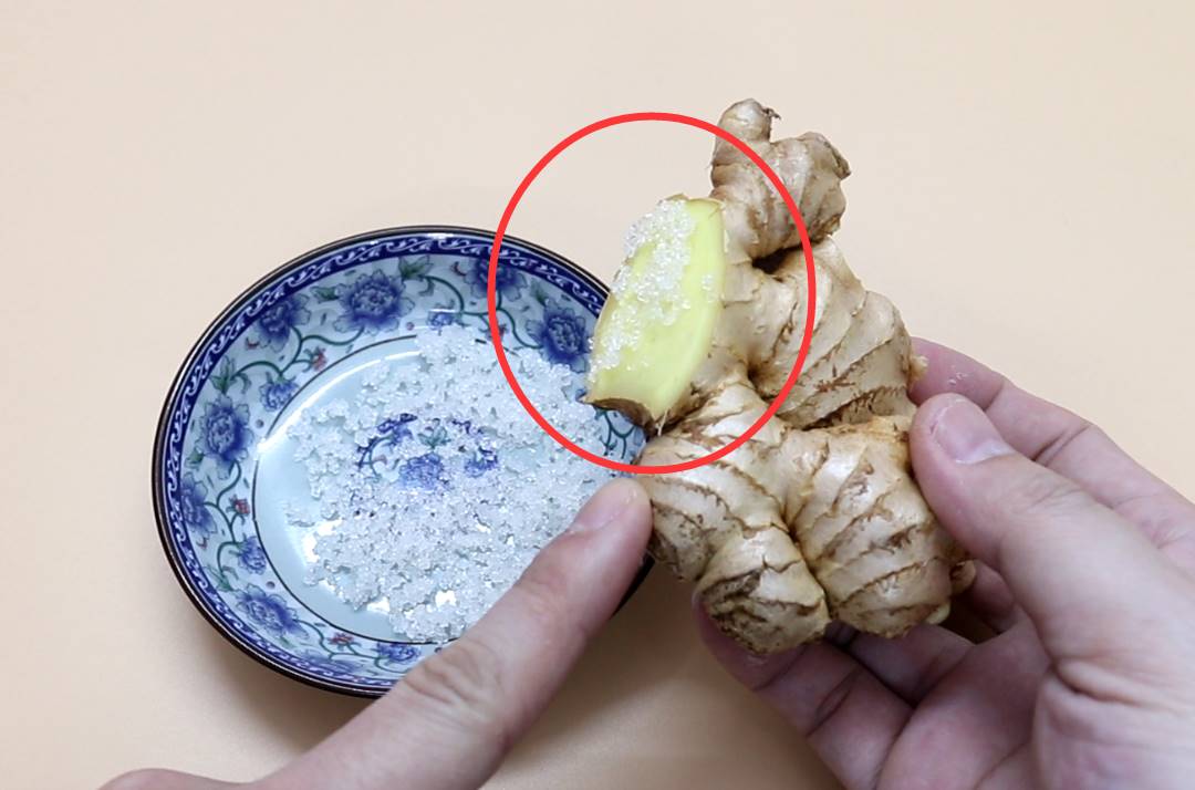我们首先把生姜切出一个横切面,然后蘸取一些白糖,我们可以用它来打磨脚后跟的死皮,可以有效的去除脚跟的老茧,效果还是非常棒的,但是如果脚跟有创口的话,最好就不要使用这个方法。