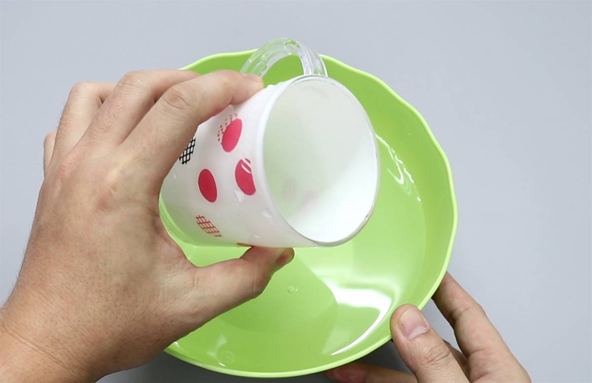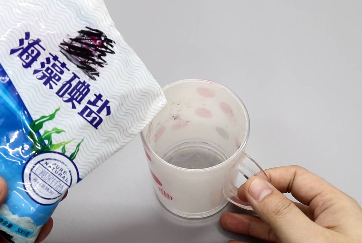 我们可以在杯子里倒入一些食盐,食盐可以增大摩擦,对于去除污渍有一定的作用。