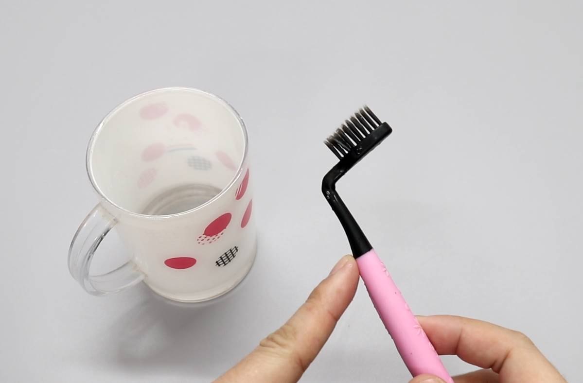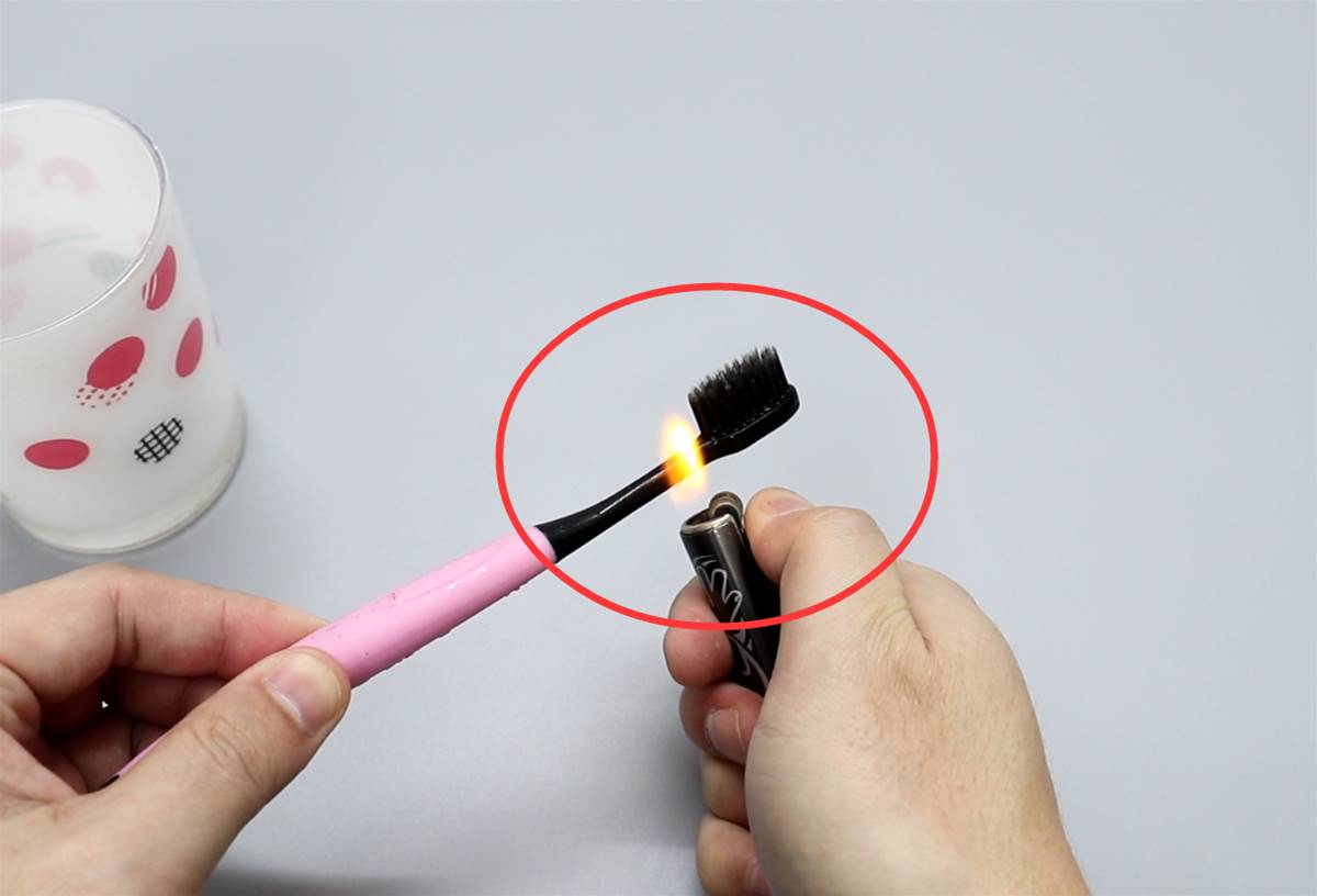 然后我们准备一个牙刷,用打火机把牙刷烘烤一下,折出一个90度角。牙刷改造好以后,就可以很轻松的刷洗漱口杯了。