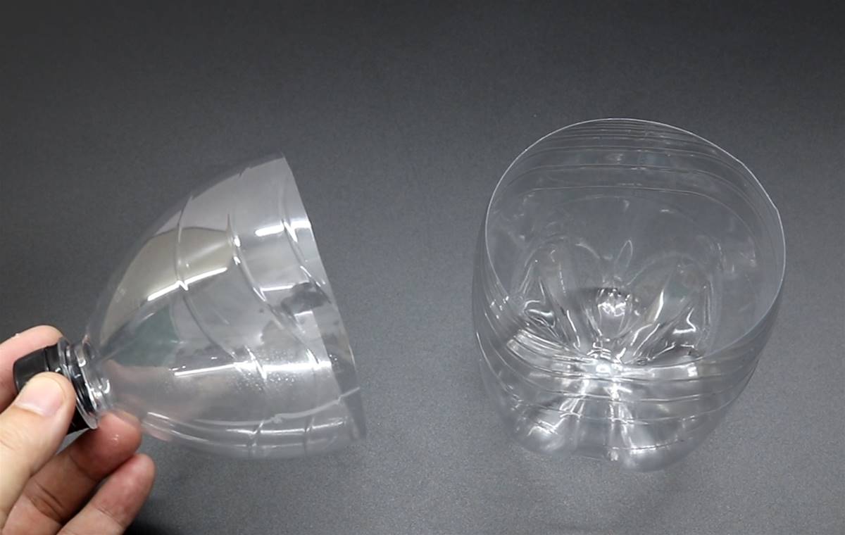 我们需要把塑料瓶清洗干净并晾干水分,然后用剪刀把它中间的部分裁剪掉,只保留瓶嘴和瓶底的部分,裁剪的边缘需要用打火机烘烤一下,这样可以起到一个防割手的作用。制作好的两个部分合起来就是一个小的收纳盒。