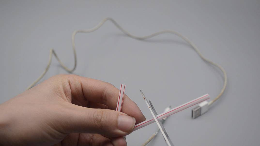 如果家里没有这种黑色绝缘胶布而需要去买觉得买一个胶布都能买一根数据线的话,那么可以试试以下这个方法。我们可以将平常喝完饮料剩下来的吸管废物利用。先剪下一节吸管,吸管的长度跟我们充电线外皮破损的长度一样长短就可以了。再将剪下来的吸管中间位置垂直剪上一刀。吸管处理好之后,我们再将吸管套在手机充电线外皮破损的位置就可以了。这样不仅能保护手机充电线,而且一样能防止使用过程中有触电的风险。