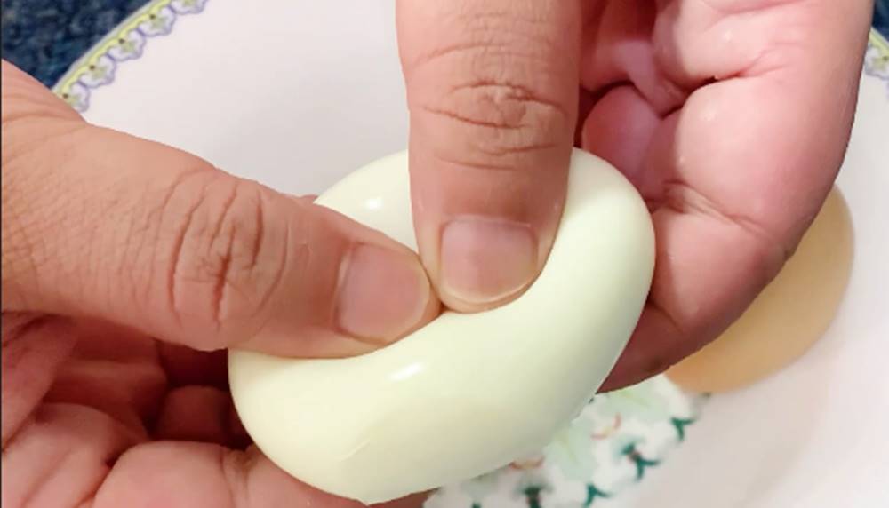 用盐水清洗一下鸡蛋清理鸡蛋上的杂质,放在锅中给它煮熟。再给大家分享一个鸡蛋煮熟以后如何去识别拿品质的好坏。煮好后过冷水,然后鸡蛋剥开。大鸡蛋品质好的里面水分就越少,用手轻轻给鸡蛋的按压,鸡蛋按得很扁,且越难裂开的鸡蛋证明它的品质是越好的鸡蛋。若这个鸡蛋,轻轻一压就弹开的鸡蛋,证明它新鲜程度稍稍差一些。