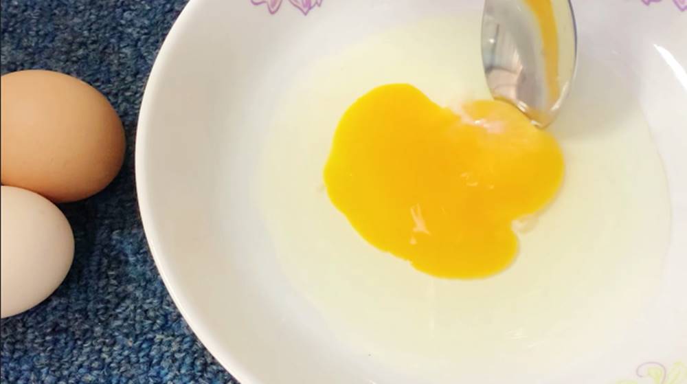 那么我们再打入白壳鸡蛋看一下。其实像这个鸡蛋的蛋黄颜色相对来说就比较深了,也更黏稠些就算一直把他提着,他的蛋清也是一直挂在勺子上,这个这个鸡蛋是卷毛买的土鸡蛋。有朋友担心说,蛋黄颜色那么深是不是大量激素?其实鸡蛋蛋黄颜色的深浅还是取决于鸡的饲料,所有鸡蛋或多或少会存在一些激素的,这些是鸡蛋本身自带黄体酮的,它本就是鸡蛋中的内源性激素,黄体酮不会对我们的身体健康造成威胁,所以大家不必担心。