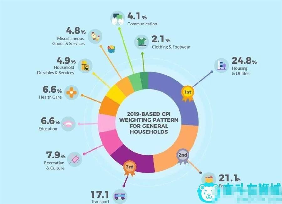 2022年,新加坡最主要的三个开销是住房和水电、食物和交通。住房和水电占了24.8%,食物占了21.1%,交通占了17.1%。