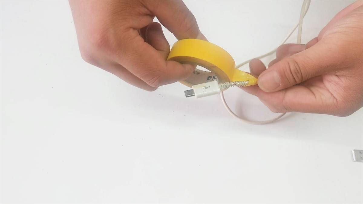 接着缠在充电器根部电线上,这时一定要耐心找出铁丝的一个头,把一个头卡在充电器的线上,就拿着铁丝去缠绕一下。像铁丝现在已经缠绕在充电器的充电头上了,再去折一下充电器。大家会看到受力的位置已经不是破裂的这个位置了,铁丝可以很好地保护破裂的位置,再用家中的绝缘胶布包裹一下。包裹好之后,再去给手机充电,就不会让充电器的根部折断了,是非常方便的。如果不及时维修,换上一根充电线,买一根要几十块钱,非常得不偿失。