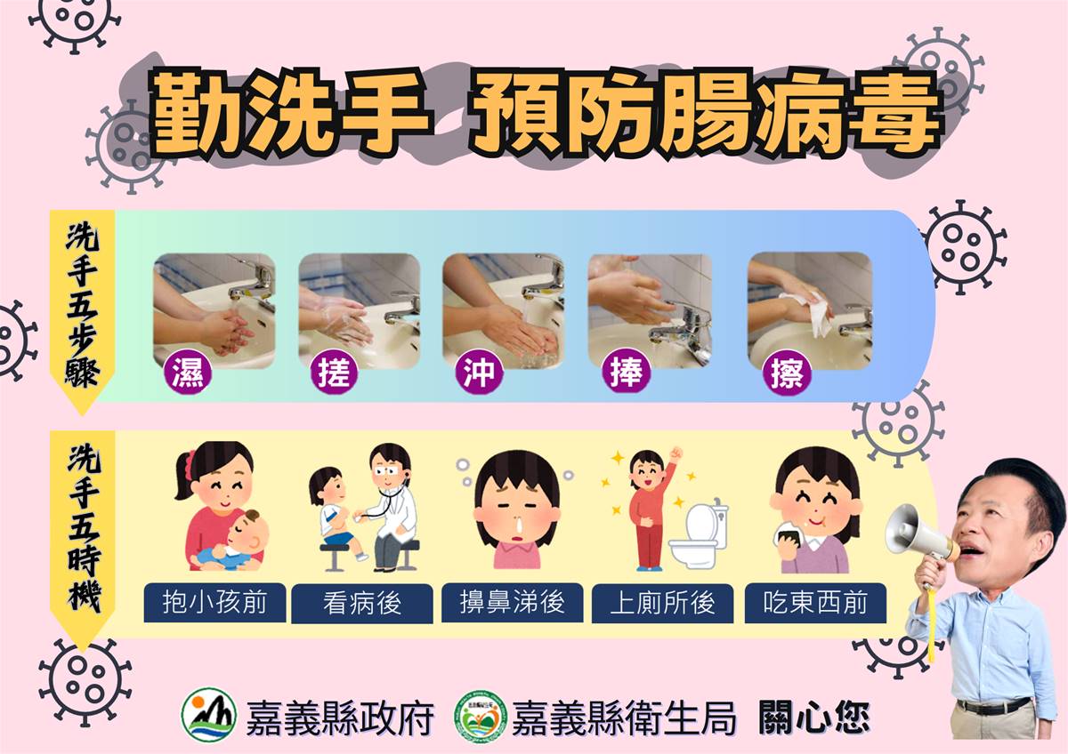 嘉義縣衛生局局長趙紋華說,當兒童出現疑似腸病毒癥狀時應立即就醫,遵照醫師建議在家休息,並與其他嬰幼兒適度區隔,落實洗手五步驟「濕、搓、沖、捧、擦」,生病期間不要到校園、安親班或其他擁擠的公共場所活動,降低傳播病毒的機會。