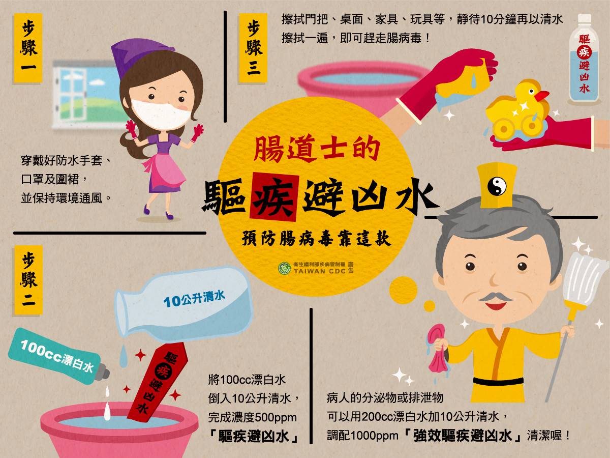 由于腸病毒仍處于流行期,校園群聚風險增加,為防堵校園疫情發生,嘉義縣衛生局針對腸病毒重點宣導,家長與學童都務必注意衛生,落實勤洗手習慣,可使用 500PPM(將漂白水以清水稀釋 100 倍)漂白水消毒環境,擦拭環境物體表面(門把、課桌椅、餐桌、柵欄及樓梯扶把等),避免疫情擴散。
