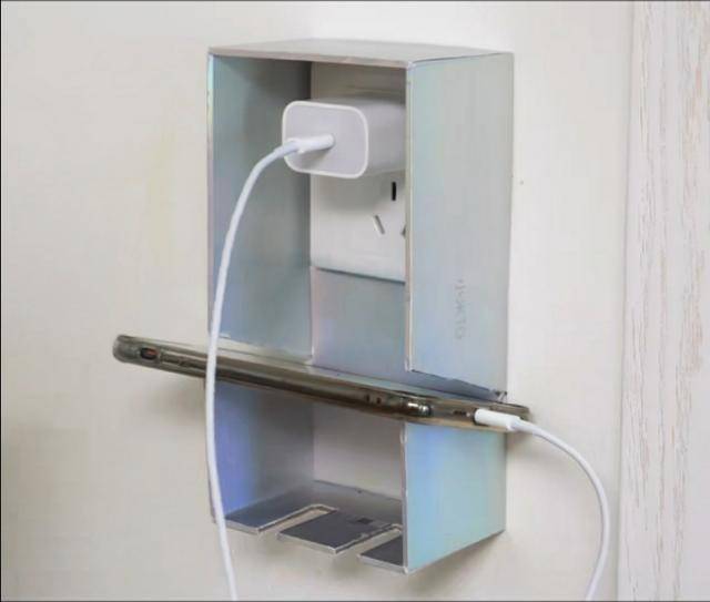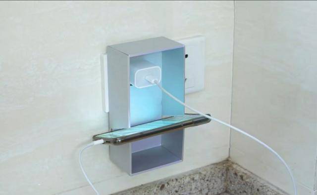 如果说手机盒太小,或者家里的插板是联排插板的话就可以比着充电头的大小,同样在手机盖子上切掉一个缺口,套在充电头上效果是一样的。
