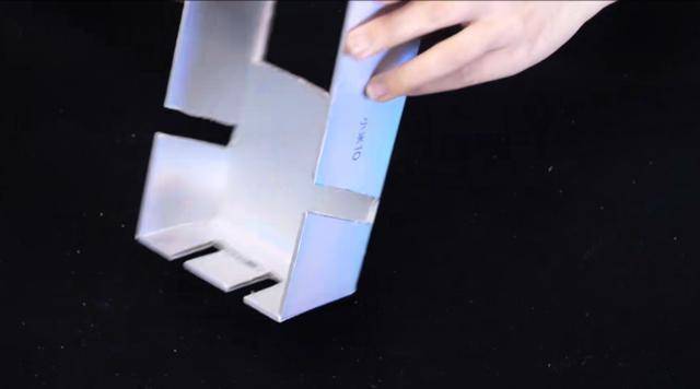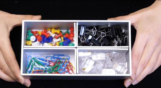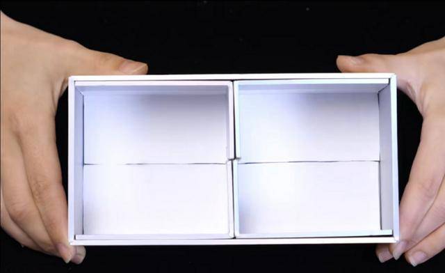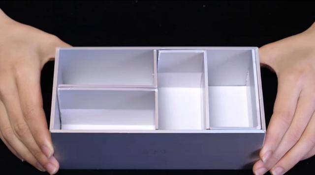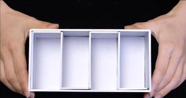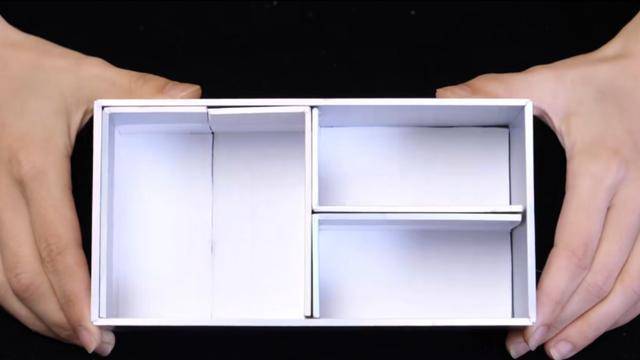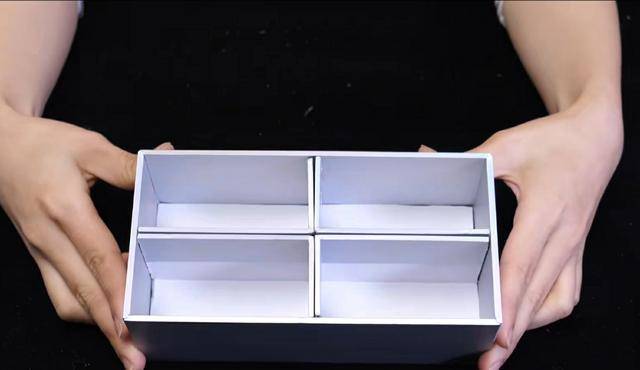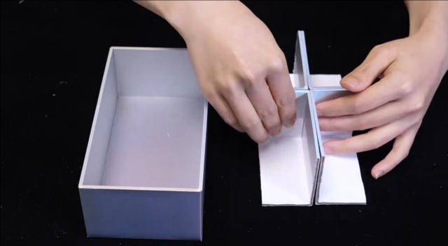 将收纳盒的盖子按图中红线切割开。然后把它们像图中那样背靠背,就可以直接放在手机盒里充当收纳盒的隔断。