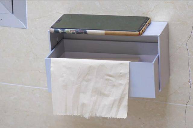 然后把盒底像图中一样放在盖子里面,就可以当卫生纸了,还可以在上面放手机。是不是很方便?