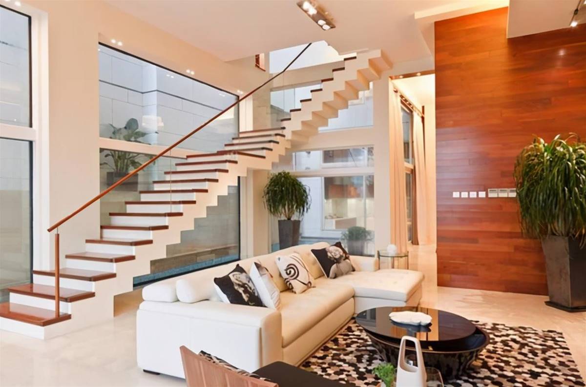 再来到黎明家里面看看,整个房间客厅设计的没有想象中的那么豪华,相对来说是非常的简单和简约的。整栋房子都是有落地窗的设计,让房间变得更加明亮起来;而上楼梯的扶手也是用玻璃来护栏,家里的墙体则是涂抹了暖色系的米黄色;整个家里的家具不是很多,只有一张简单的沙发就没了。