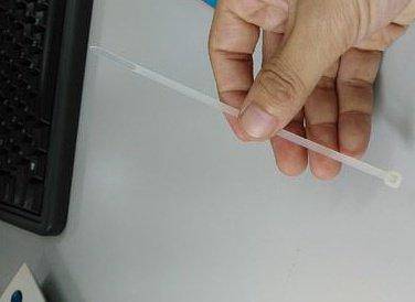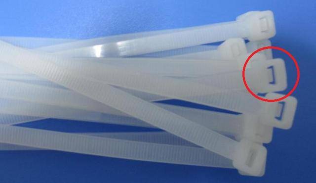 我们可以先观察一下扎带,扎带一头是尖的,另一头是穿口,有一面有锯齿一样纹路。仔细观察穿口,我们可以看到,扎带之所以能够卡住,是因为扎带头里有一个卡扣卡住了扎带。