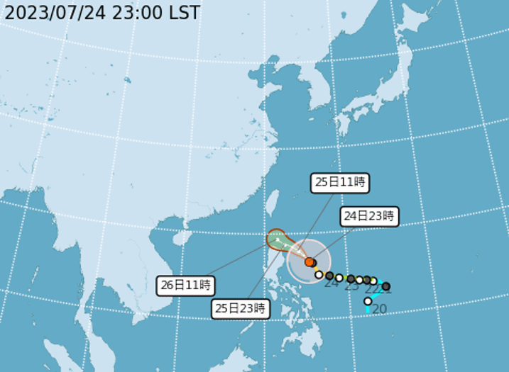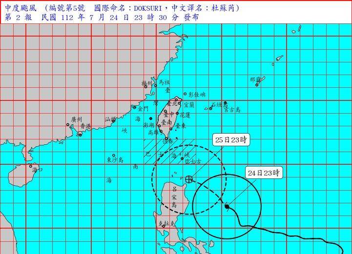 5号中度颱风「杜苏芮」(Doksori)暴风圈已经逼近台湾,对巴士海峡构成威胁,中央气象局今天(24日)深夜11时30分持续针对附近海域发布「海上颱风警报」,並做出说明。依据最新路径显示,杜苏芮越来越偏离台湾陆地北上,预估明天晚上暴风圈将逼近台湾东南方海域,並於26日(周三)可能触陆,天气风险公司总经理彭启明依据最新颱风路径预测,认为杜苏芮走向再度往南微调「暴风圈横跨到哪些县市?」有触陆南台湾的可能。