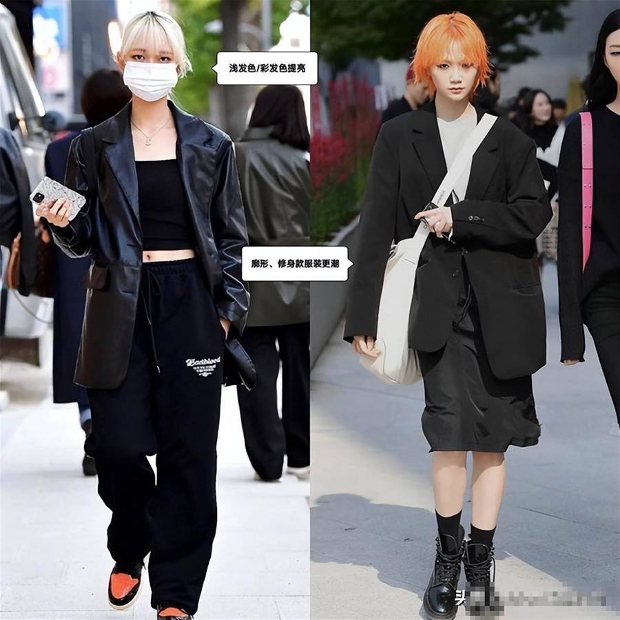 ①淺色/彩發色配廓形、緊身款黑衣更潮