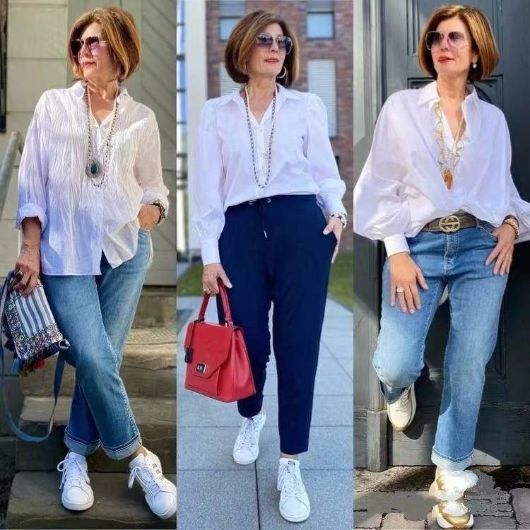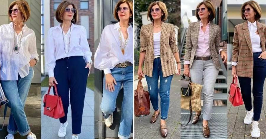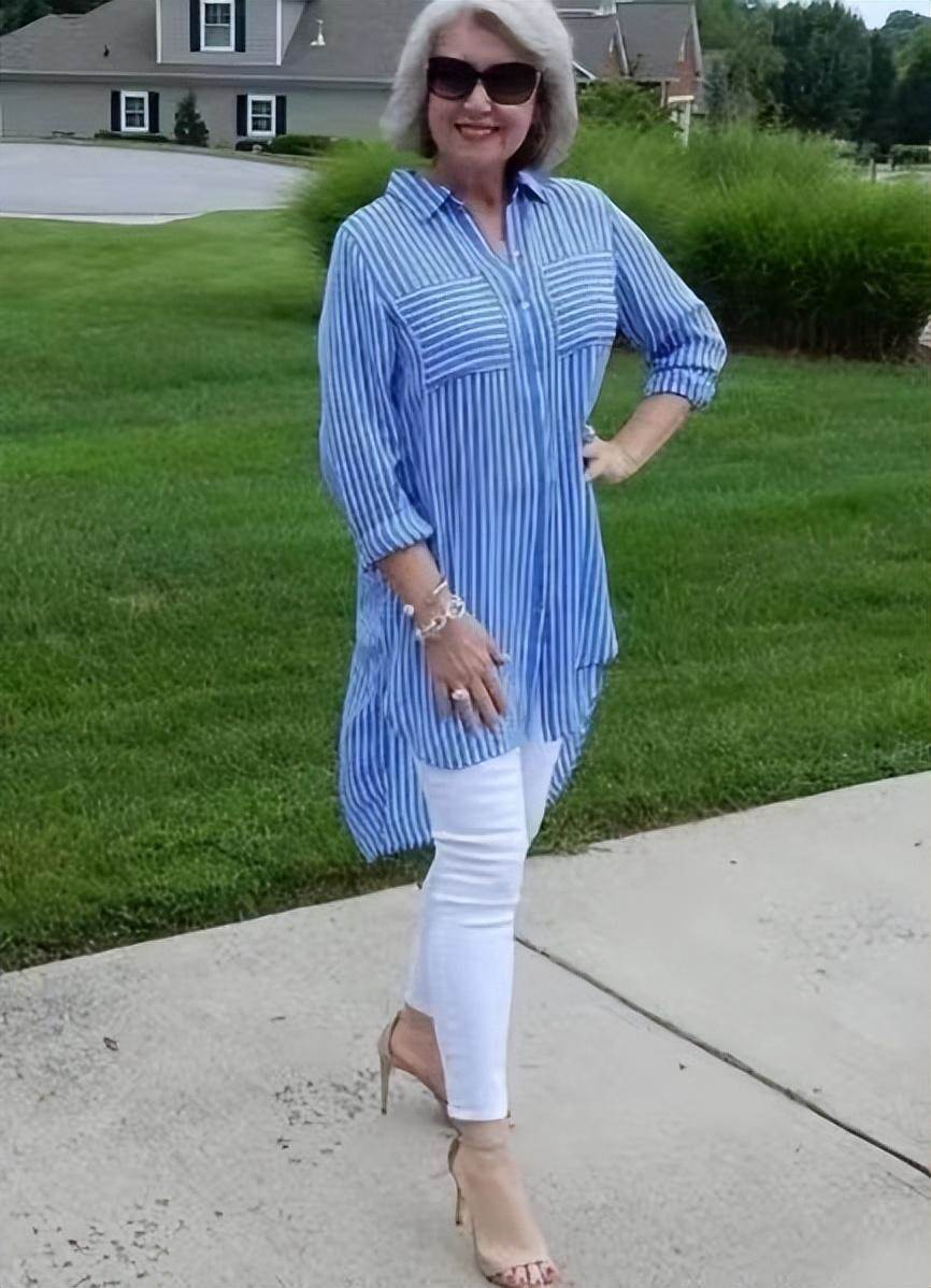 首先,豐滿型老年人要借助穿衣技巧,讓上下身的層次感更強。推薦大家試試對比法,舉個簡單例子,我們可以用材質輕柔單薄的襯衫搭配牛仔褲、西裝褲,通過材質之間的對比,讓造型更具層次感。