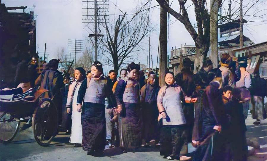 一群滿族婦女帶著孩子在街上閑逛。圖中有兩個很有意思的細節,仔細看的話能夠看到圖中右側有一個北洋新軍士兵,可能是有大人物路過,士兵在街上站崗。還有一個就是人群頭頂的電線桿,跟現在的電線桿區別不是很大。