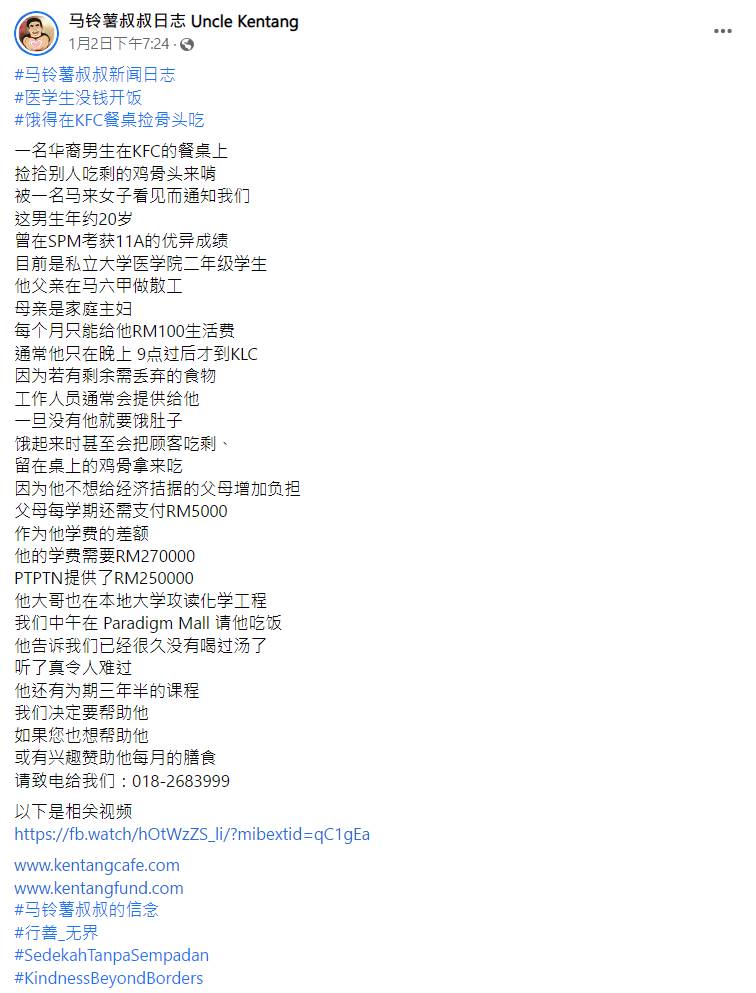 馬來西亞慈善組織「馬鈴薯叔叔」近日在臉書分享這個令人心疼的故事,表示這名年約20歲的華裔男大生成績優異,目前就讀某私立大學醫學院二年級