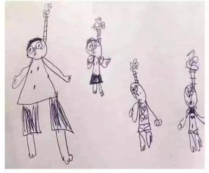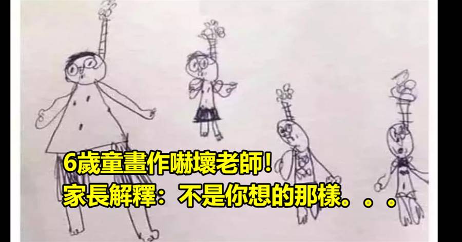 國外一名老師看到6歲的學生,畫了一幅全家人的畫作,讓他看得相當緊張,立刻請家長去學校開緊急會議,所幸父母告知是烏龍一場。